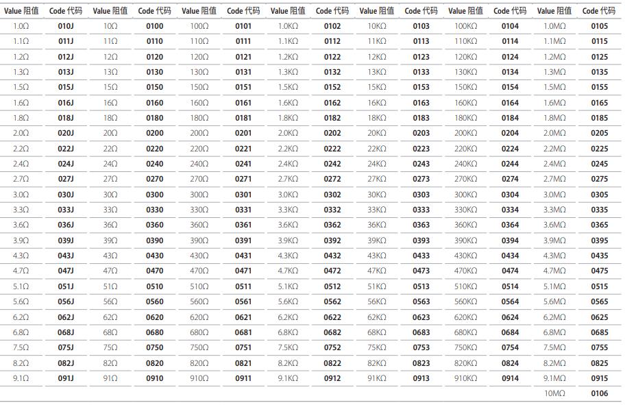 E-24 系列標準厚聲電阻阻值和料號系統使用代碼 ( 4 位 , 以 0 為首位 , 2%、5%、10% 公差 )
